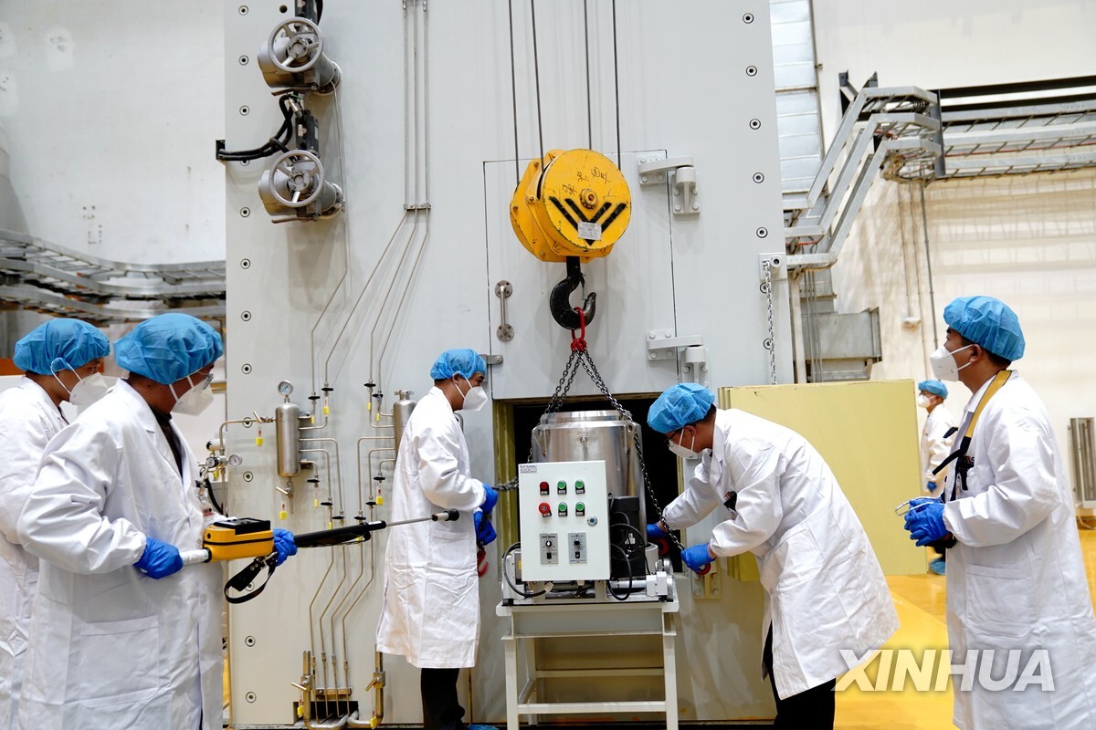 지난달 24일 중국 간쑤성 우웨이시에 있는 중국과학원 상하이 응용물리연구소 우웨이 캠퍼스에서 연구원들이 토륨 용융염 원자로를 연구하는 모습. 신화=연합뉴스