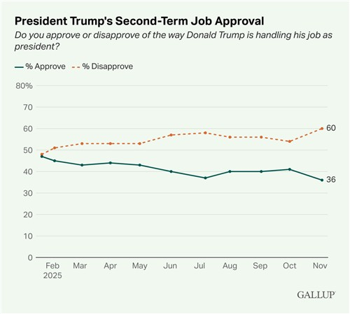 조지워싱턴대 토드 벨트 교수는 정치전문매체 더힐을 통해 "유권자들은 바이든 정부 시절의 문제를 해결하기 위해 트럼프를 선출했으나 성과를 내지 못하고 있다"며 특히 관세 정책이 핵심적인 걸림돌이 되고 있다고 지적했다.