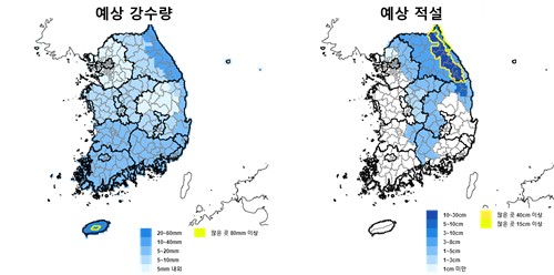 이번 강수는 강원 산지와 동해안, 제주도에 집중될 것으로 보인다. 예상 적설량은 강원 산지 10~30cm(최고 40cm 이상), 경북 북동 산지 5~10cm, 강원 북부 동해안 3~10cm(최고 15cm 이상)가 될 것으로 전망됐다. 강원 내륙과 중부 동해안은 3~8cm, 서울과 경기 북서부는 1cm 미만의 눈이 쌓일 것으로 예상됐다. 기상청은 중부지방의 기온 경계선에 따라 수도권의 적설량이 늘어날 가능성도 배제할 수 없다고 덧붙였다.