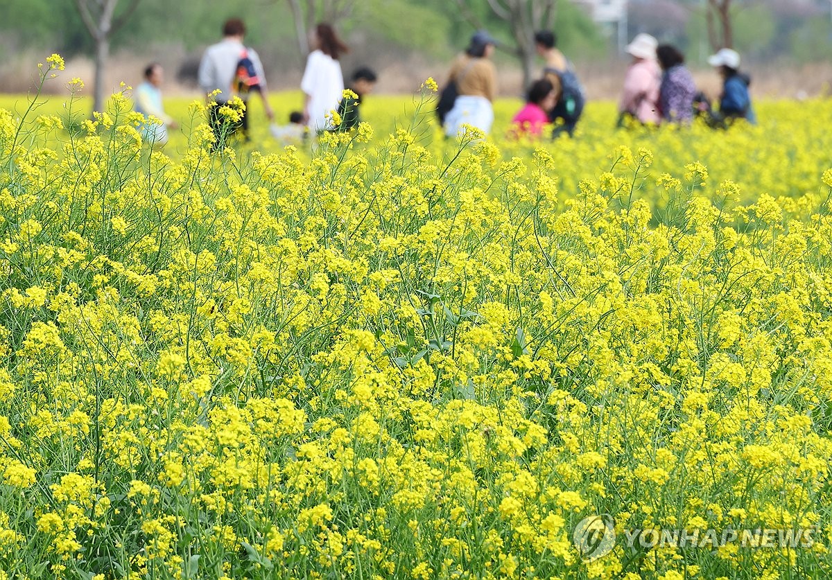 화창한 봄 날씨를 보인 13일 오후 부산 대저생태공원 유채꽃밭에서 나들이객들이 노란 봄을 즐기고 있다. 연합뉴스