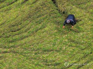 가을장마가 계속되고 있는 16일 경북 상주시 한 논의 벼가 비바람에 누워 있는 가운데 농민이 싹 틔운 벼 이삭(수발아)을 살펴보고 있다. 연합뉴스