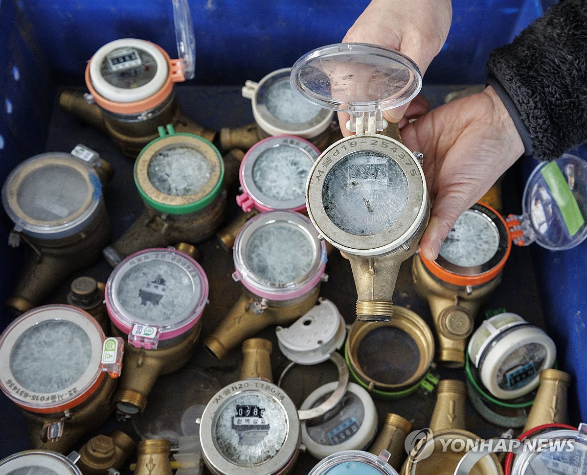 서울 강북구 북부수도사업소 관계자가 최근 동파된 수도 계량기를 정리하고 있다. 수도사업소 관계자는 일 평균 10건 정도의 수도 동파 신고가 접수되고 있다고 밝히며 최근 추위로 인해 동파 신고 건수가 늘어날 것으로 예상한다며 수도 동파 방지를 위한 보온에 신경 쓸 것을 당부했다. 연합뉴스