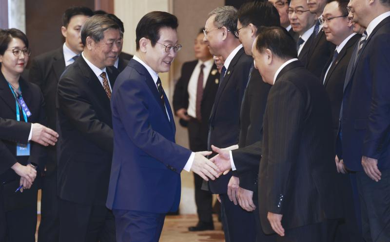 ▲중국을 국빈방문 중인 이재명 대통령이 5일 베이징 조어대에서 열린 비즈니스 포럼에서 중국 기업인들과 인사하고 있다. 연합뉴스
