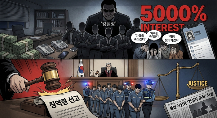 최고 연 5,000%가 넘는 살인적인 고금리를 챙기고, 채무자의 가족까지 살해하겠다고 협박한 불법 사금융 범죄단체, 일명 '강실장 조직'의 일당이 무더기로 징역형을 선고받았다.