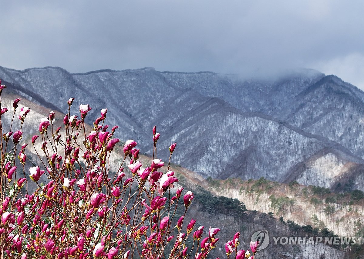 전국 곳곳에 연일 봄눈이 내린 14일 강원 양양군 구룡령 옛길의 눈 쌓인 자목련 너머로 백두대간 설경이 펼쳐지고 있다. 연합뉴스